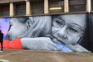 Following her first mural in Le Marais, Zabou also created a second large-scale artwork in the 14th district. It’s a touching image of two teenagers, 12 years old Natacha…