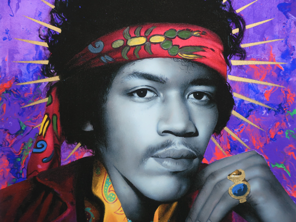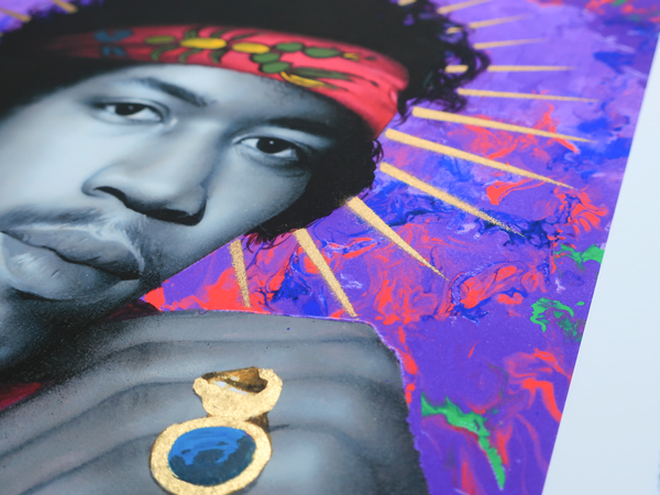 DESCRIPTION: Reproduction rehaussée à la main de ‘Jimi’, une oeuvre montrant le portrait du chanteur et guitariste américain Jimi Hendrix sur un fond violet éclatant.