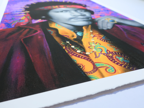 DESCRIPTION: Hand-finished digital print of ‘Jimi’, an artwork showing the portrait of American guitarist and singer-songwriter Jimi Hendrix on a vibrant purple background.